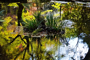澄み切った池の水に季節的に所々紅葉した木々が反射して水面に映る逆さ風景が最高な絵になりました。