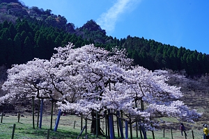 この桜の近くに馬頭観音様が祀ってあり、そこからこの桜は「観音桜」と呼ばれているそうです。中岳、高岳等の阿蘇の山々をこの桜の背景に成る様に眺めて見ると、その眺めは雄大で絶好のロケーションとなっています。
